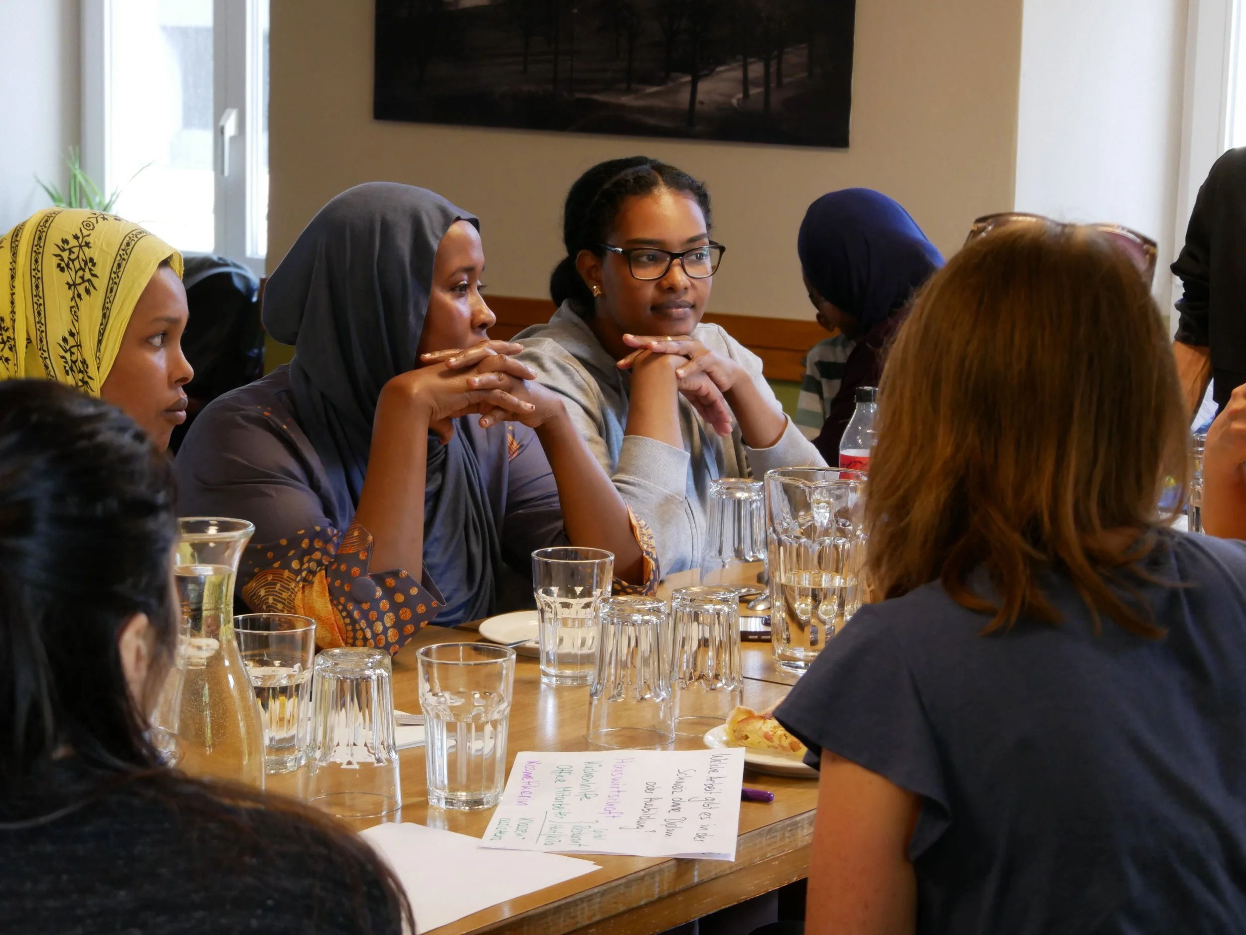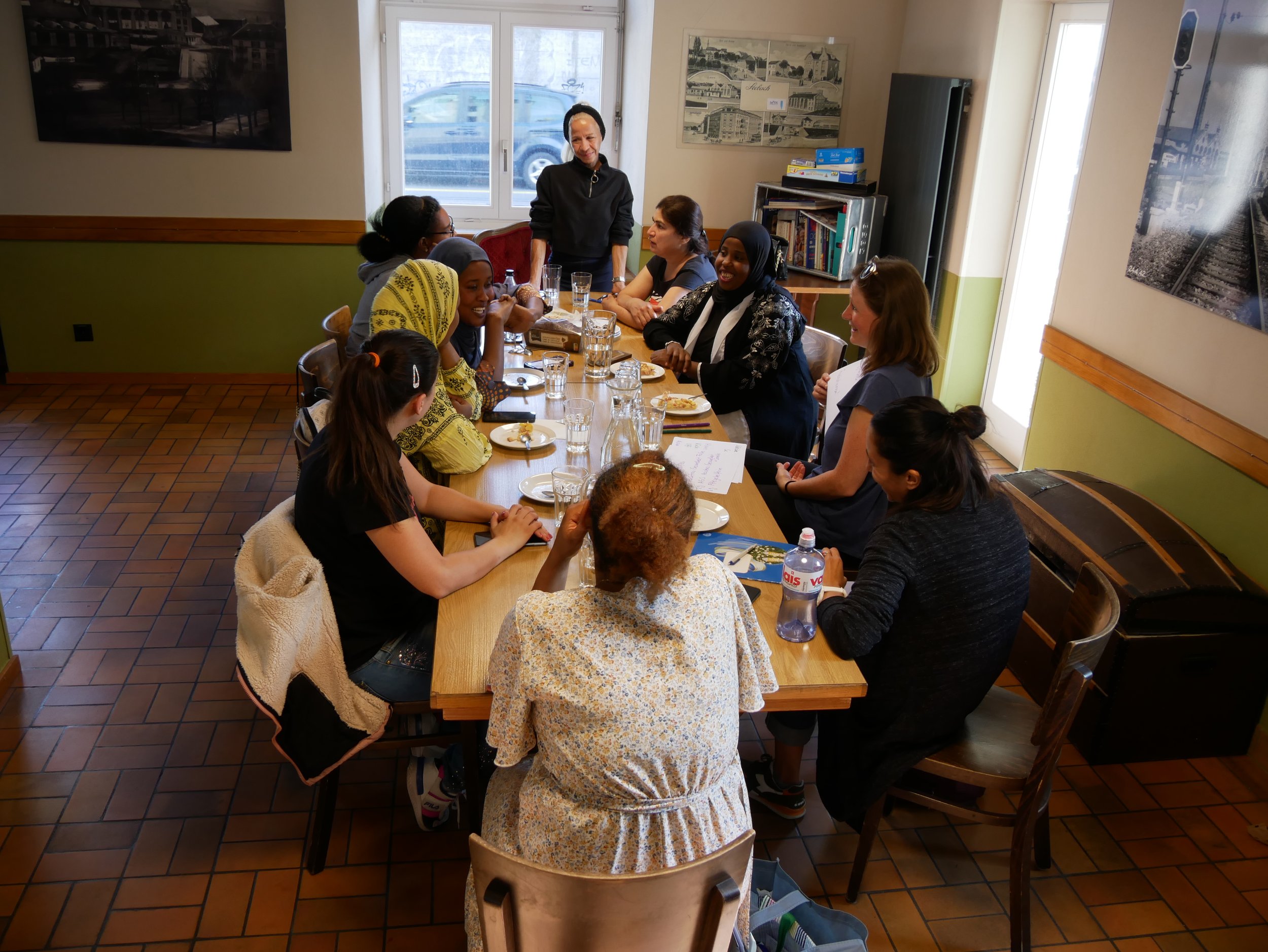 Im Zentrum unseres Angebots steht das Sprachcafé, in dem Migrantinnen ihre Deutschkenntnisse anwenden, zu Alltagsthemen austauschen und sich gegenseitig unterstützen. Daneben bieten wir Beratung zu Fragen rund um Arbeit, Ausbildung und Wohnen sowie Unterstützung bei der Stellensuche und Korrespondenz mit Behörden. In unserer Kreativwerkstatt stellen wir mit Menschen aus aller Welt Karten mit einer positiven Botschaft her, um damit das Quartier zu beschenken.